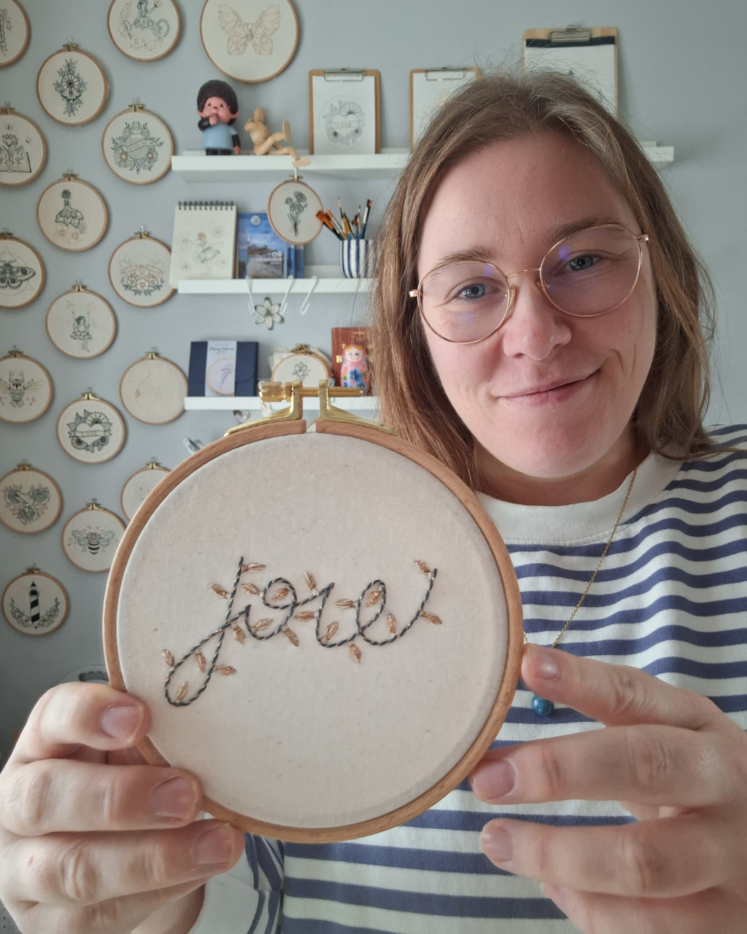 S’ensuit la création d’un compte INSTAGRAM, où j’ai pu découvrir, tester et apprendre énormément. Durant trois années, j’ai testé beaucoup de choses : broder sur des tote bags, des vêtements, des photos, créer des broches et des badges, mais mon support préféré reste un morceau de coton écru qu’on laisse sur un tambour en bois.